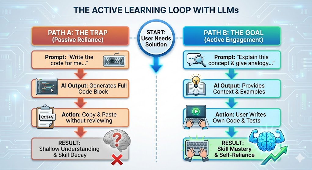 Path A is the trap—it feels productive but leaves you with shallow understanding and eroding skills. Path B is the goal—it takes more effort, but builds genuine mastery and self-reliance.